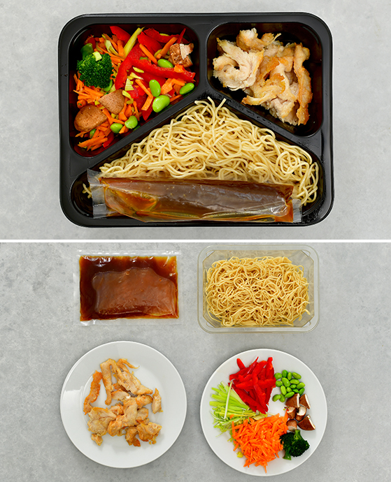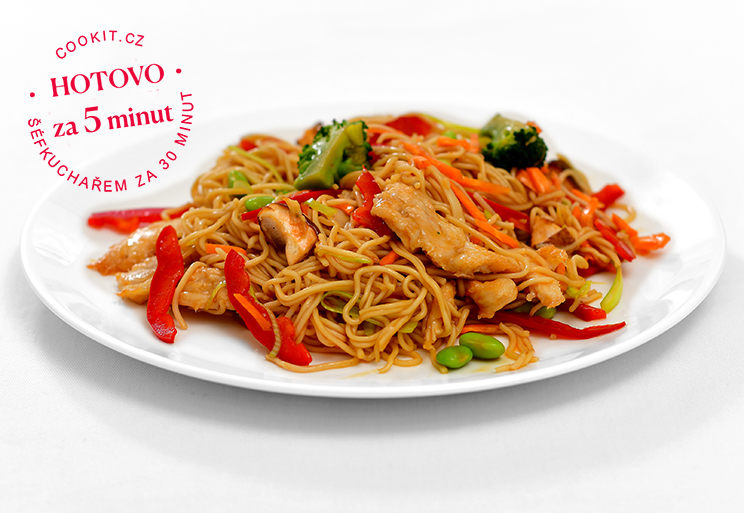 Složení: čínské bezvaječné nudle 41 % (PŠENIČNÁ mouka, sůl, regulátory kyselosti: uhličitan draselný a hydrogenuhličitan sodný), omáčka teriyaki 23 % (omáčka sójová světlá (voda, SÓJOVÉ boby, sůl, PŠENIČNÁ mouka, konzervant: sorbát draselný), mirin (lepkavá rýže 36%, voda, rýže 30%, extrakt citronu), voda, cukr, citronová šťáva, česnek, zázvor, kukuřičný škrob), kuřecí nudličky pečené 11 % ([kuřecí prsa, škrob kukuřičný, omáčka sójová světlá (voda, SÓJOVÉ boby, sůl, PŠENIČNÁ mouka, konzervant: sorbát draselný), vaječné bílky (pasterizované a chlazené vaječné bílky (90%), voda, konzervant: sorban draselný, regulátor kyselosti: kyselina mléčná, stabilizátory: xantanová guma), olej řepkový] mrkev, fazole edamame, brokolice, shiitake, paprika, pórek.