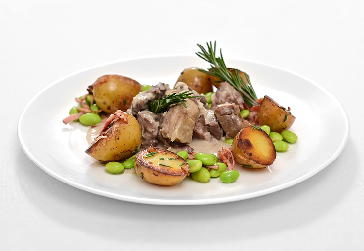 Křehká jehněčí kýta připravená metodou sous-vide v krémové smetanové omáčce je doplněna fazolkami edamame a opečenými mini bramborami se slaninou.
