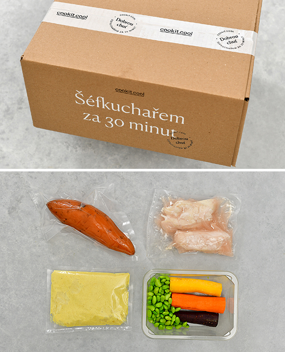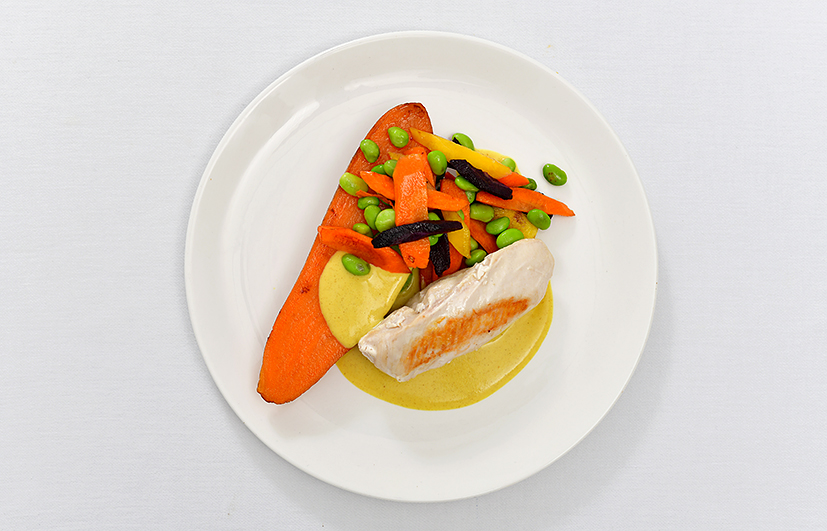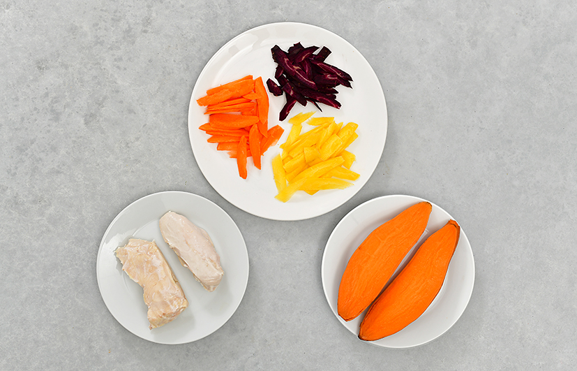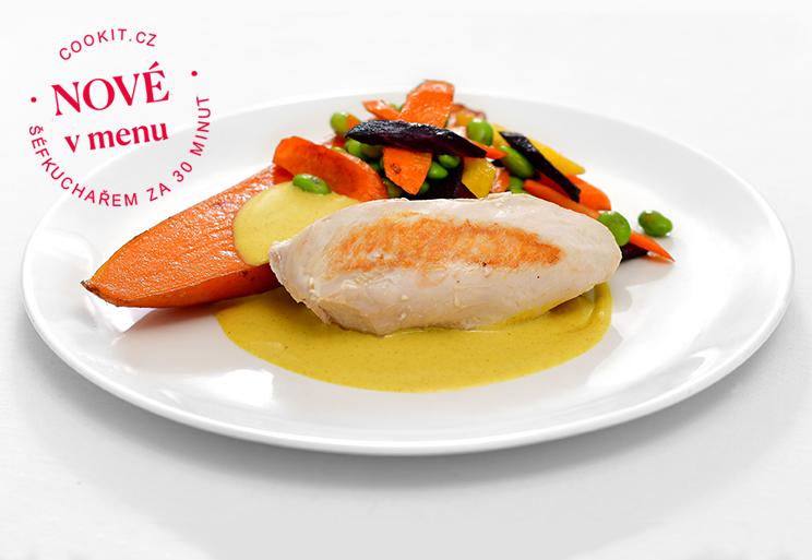 Šťavnatá kuřecí prsa připravená metodou sous vide s dijonskou omáčkou jsou doplněna opečeným batátem a křupavou zeleninou.