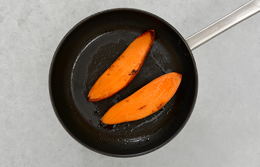 - Na velkou pánev dáme 1 lžíci (15 ml) oleje a rozehřejeme na střední stupeň. Vložíme batát slupkou dolů a opékáme 2 minuty.