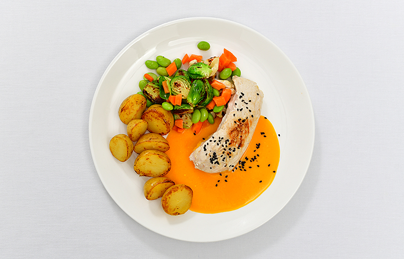 s kokosovým mlékem, mini brambory a opečená zelenina