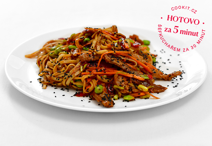Návod na přípravu: 1) Rozehřejeme pánev na vysoký stupeň. Vložíme zeleninu s masem a opékáme 30 sekund. 2) Přidáme omáčku, snížíme teplotu na střední stupeň a ohříváme 30 sekund. 3) Vložíme těstovinu, promícháme a ohříváme 1 minutu.
