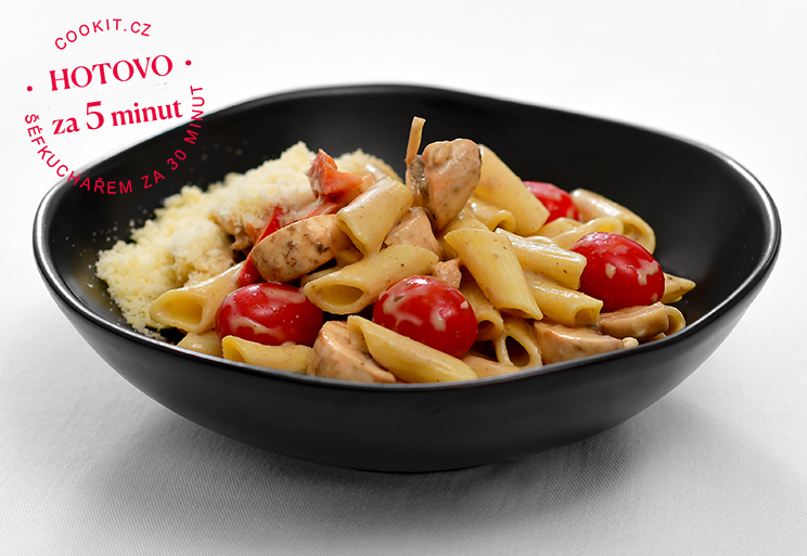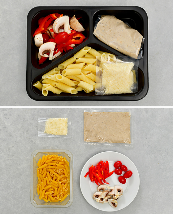 Složení: vařené těstoviny penne 45 %, (voda, semolina - mouka z tvrdé PŠENICE), omáčka hříbková 25 % (SMETANA ke šlehání 30% (SMETANA, stabilizátor: karagenan), směs hřibovitých hub v různém poměru (klouzek obecný, hřib hnědý, křemáč osikový a březový, kozák březový a habrový, hřib smrkový), olivový olej, škrob kukuřičný, omáčka sójová (voda, sójové boby, pšenice, sůl), sůl), rajčata cherry, paprika, žampiony, sýr gran moravia (MLÉKO, sůl, syřidlo, konzervant: lysozym z vajec).